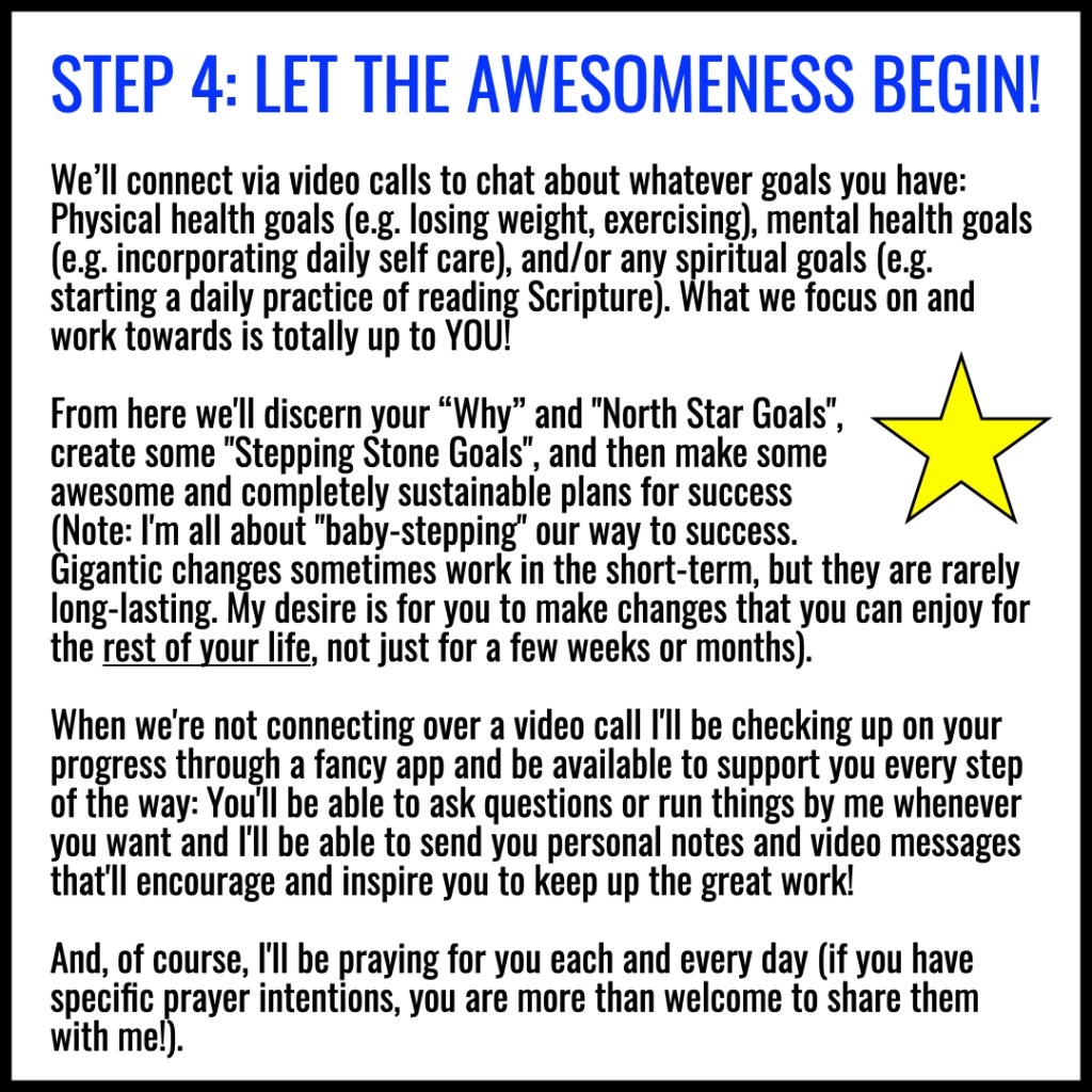 If you’re tired of trying to make lasting change all on your own and dream of a living a happier, healthier, and holier life, know that I’m here for you and SO excited for all that your future has to offer.