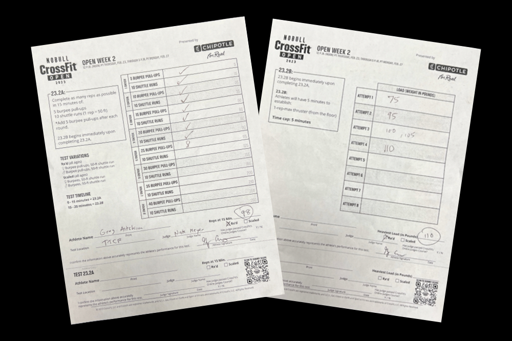 I managed to get 98 reps on part A (58 burpee pull-ups + 40 50 ft. shuttle runs) and hit a 110# thruster (new PR!).