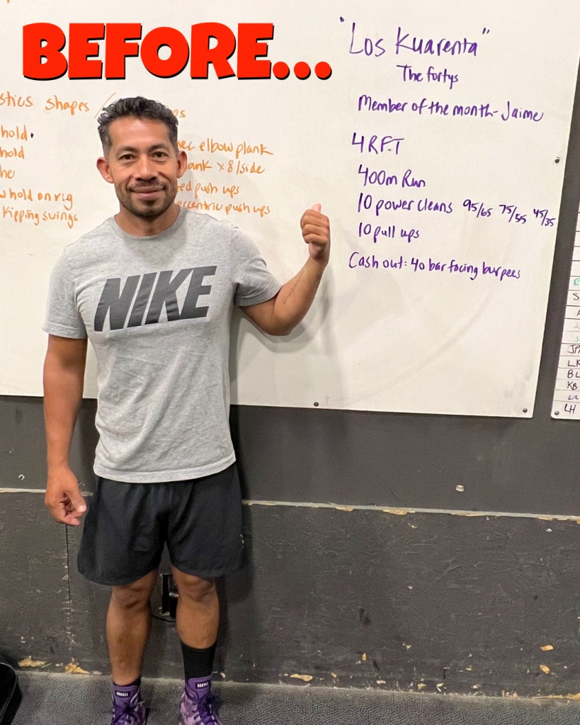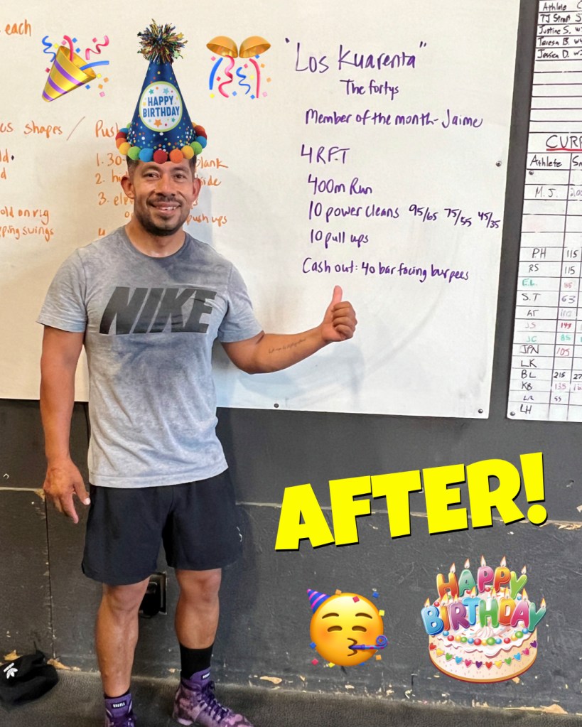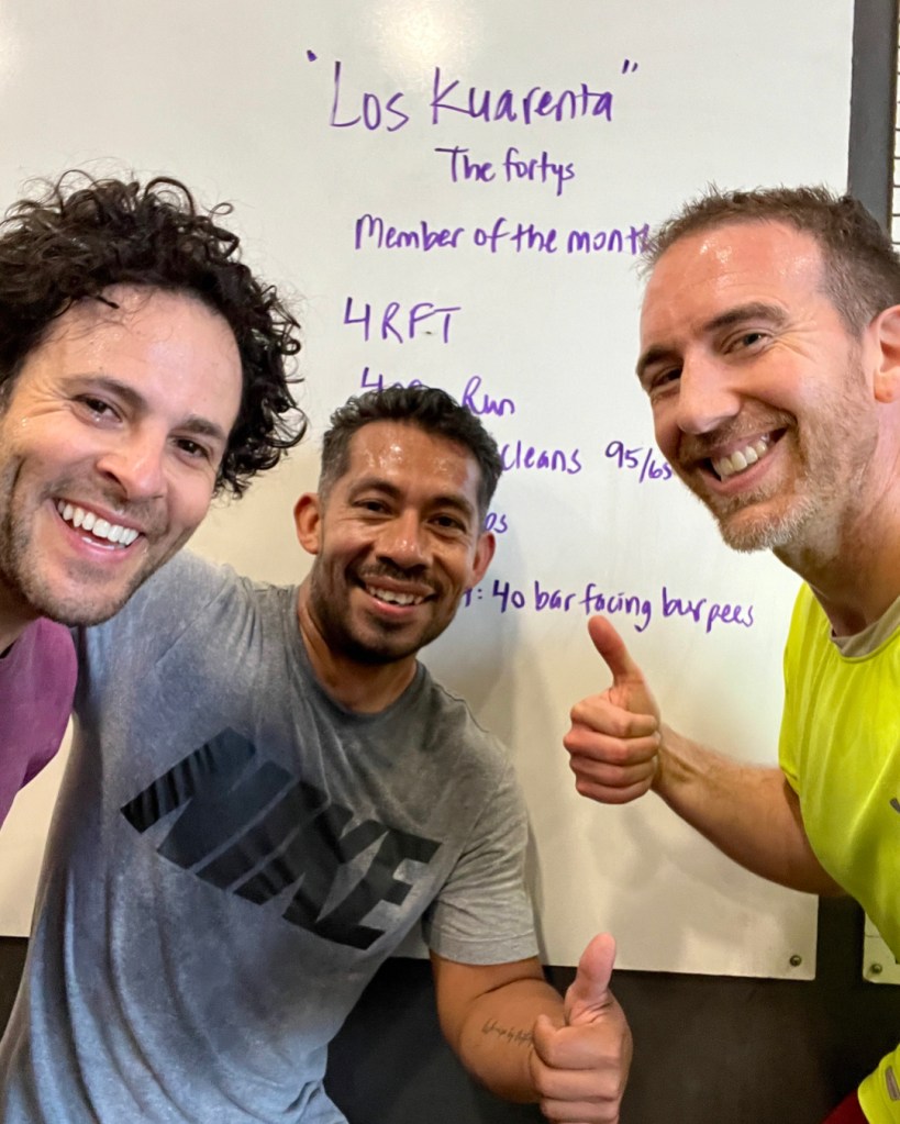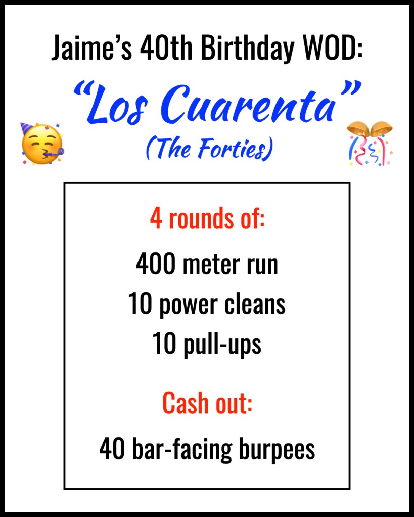 It just so happened it’s also Jaime’s 40th birthday (tomorrow), which is why he named the workout “Los Cuarenta” (“The 40s”) and designed it to include 40 power cleans, 40 pull-ups, and 40 burpees (details below).