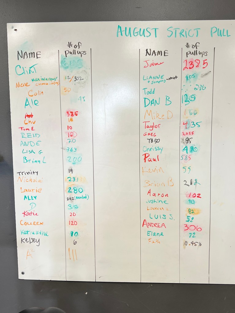 In August my gym (Tangletown CrossFit in Minneapolis, MN) put on a pull-up challenge: See how many strict pull-ups (overhand, underhand, and hammer grip all accepted) you can do throughout the month.